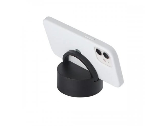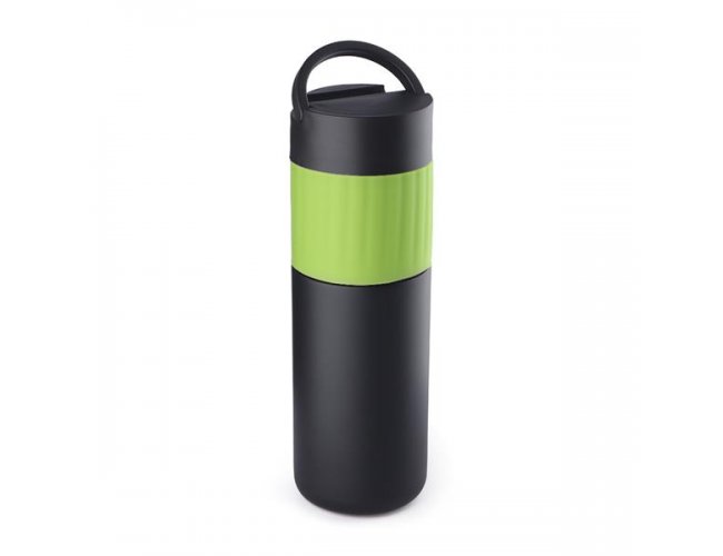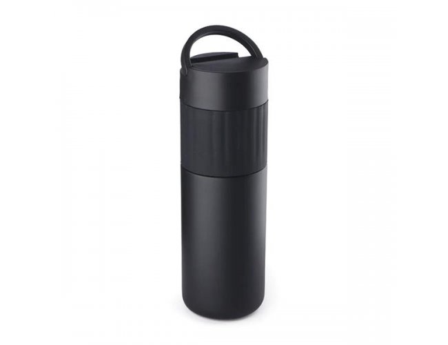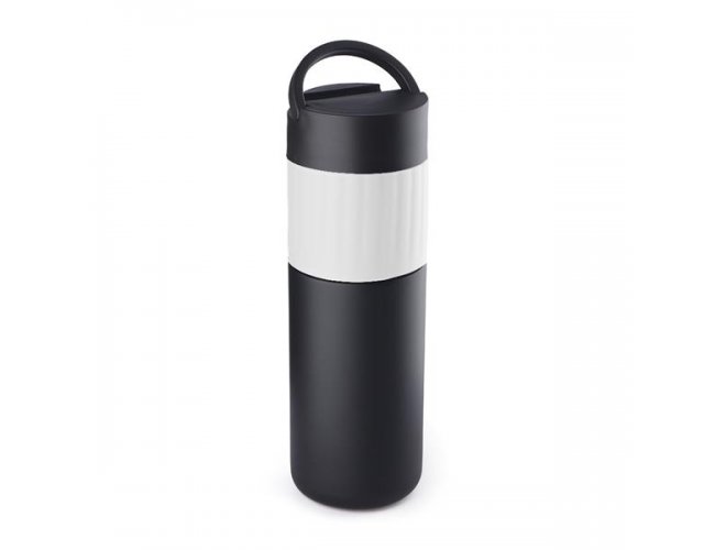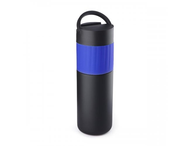 Garrafa térmica de inox com capacidade de 500ml. Tampa com alça e suporte para celular. Detalhe emborrachado.