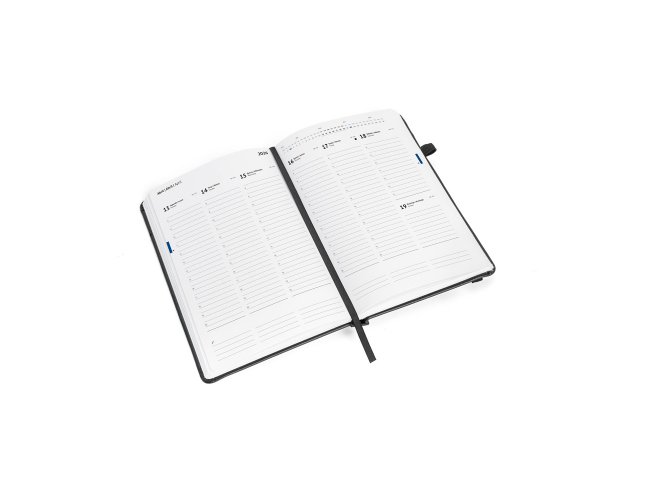 Agenda B5 em PU à base de água. Inclui um suporte para esferográfica (não inclusa), marcador em fita e um elástico para fechamento da agenda. Está organizada em plano semanal (70 g/m²). 175 x 245 mm
